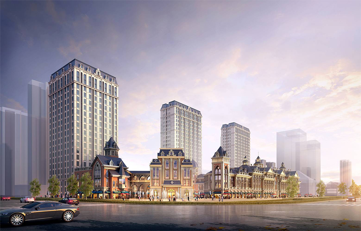 本項(xiàng)目的設(shè)計(jì)不僅關(guān)注構(gòu)建建筑,更注重于營造空間,打造體驗(yàn)。設(shè)計(jì)師通過營造引人矚目、優(yōu)雅浪漫的步行街道空間來豐富人們的商業(yè)體驗(yàn)。同時(shí),設(shè)計(jì)師賦予了建筑歷史厚重感,恰如其分地將歐式風(fēng)格與商業(yè)氛圍融合在一起。商業(yè)部分以優(yōu)雅、浪漫為主要基調(diào),采用了段落式重復(fù)狀的開窗形式以及局部色彩小面積變化的表現(xiàn)方式;裝飾采用的是顏色莊重大氣的石材或仿古石材裝飾面;細(xì)節(jié)處理部分運(yùn)用柱廊、雕花、線條、鐵藝等形式,呈現(xiàn)出浪漫典雅的風(fēng)格,追求建筑的詩意;屋頂部分則采用坡度且有轉(zhuǎn)折的屋頂形式,意在打造一個(gè)具有歐式風(fēng)情街區(qū)的建筑形象。
