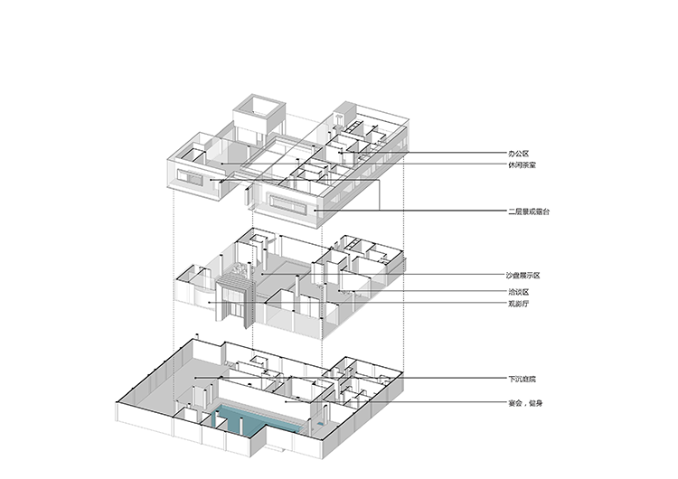 地下一層設(shè)施宴會(huì)廳及泳池,健身設(shè)施等,可以用來滿足不同訪客的需求,其次設(shè)置內(nèi)庭院與之相接,供訪客休憩,私密性好,有悠然自得之感。