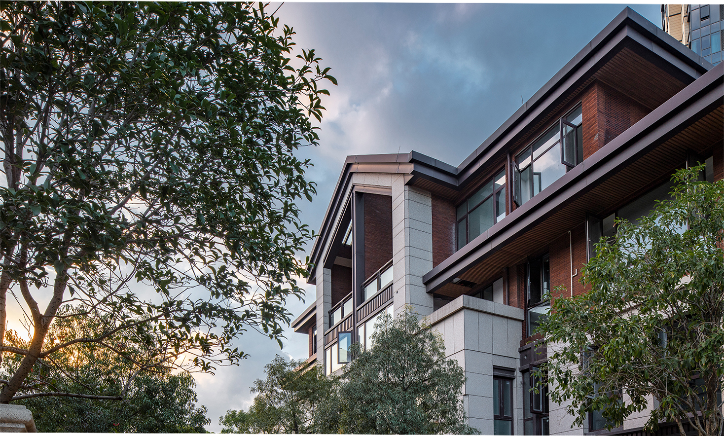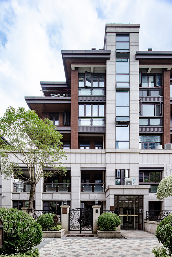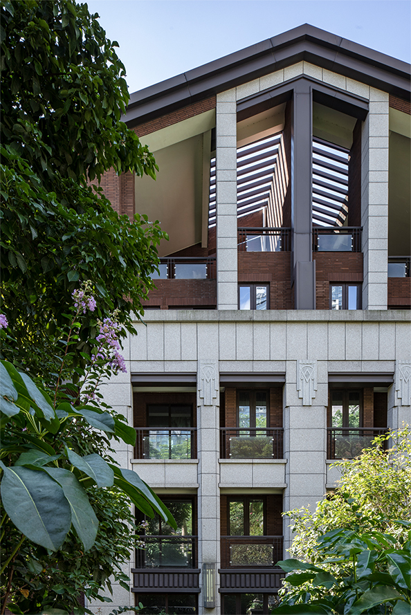 別墅區(qū)外立面選用“賴特草原風(fēng)格”,厚重的石材基座、磚紅色條磚、大尺度外挑的四坡頂均是風(fēng)格重要的建筑語言??紤]到項目都市核心區(qū)域,立面設(shè)計中在風(fēng)格基礎(chǔ)上多增加了建筑細部的處理,檐口的細部、檐底的木飾面、基座的石材細節(jié),讓“草原風(fēng)格”別墅狂野的個性有所收斂。