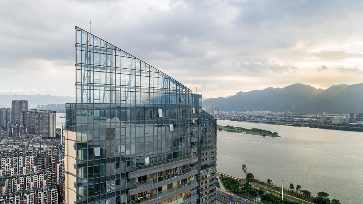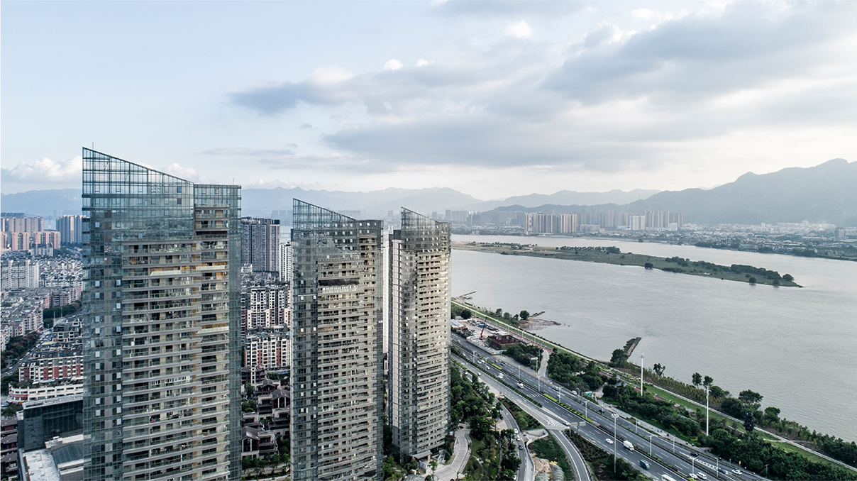 地塊位處橘園洲大橋立交旁,是烏龍江沿線地塊承上啟下的重要節(jié)點。項目從城市設(shè)計的角度出發(fā),將4棟高層體量規(guī)整為3棟,向上堆疊,形成130米、140米、150米三棟超高層建筑。建筑外立面采用玻璃結(jié)合陶板的全干掛幕墻系統(tǒng),三角形頂部幕墻的形體設(shè)計帶有江畔揚帆的寓意,從建筑表皮及建筑形體兩方面區(qū)別于沿線其他的高層住宅樹立項目的江畔橋頭地標性建筑形象。
