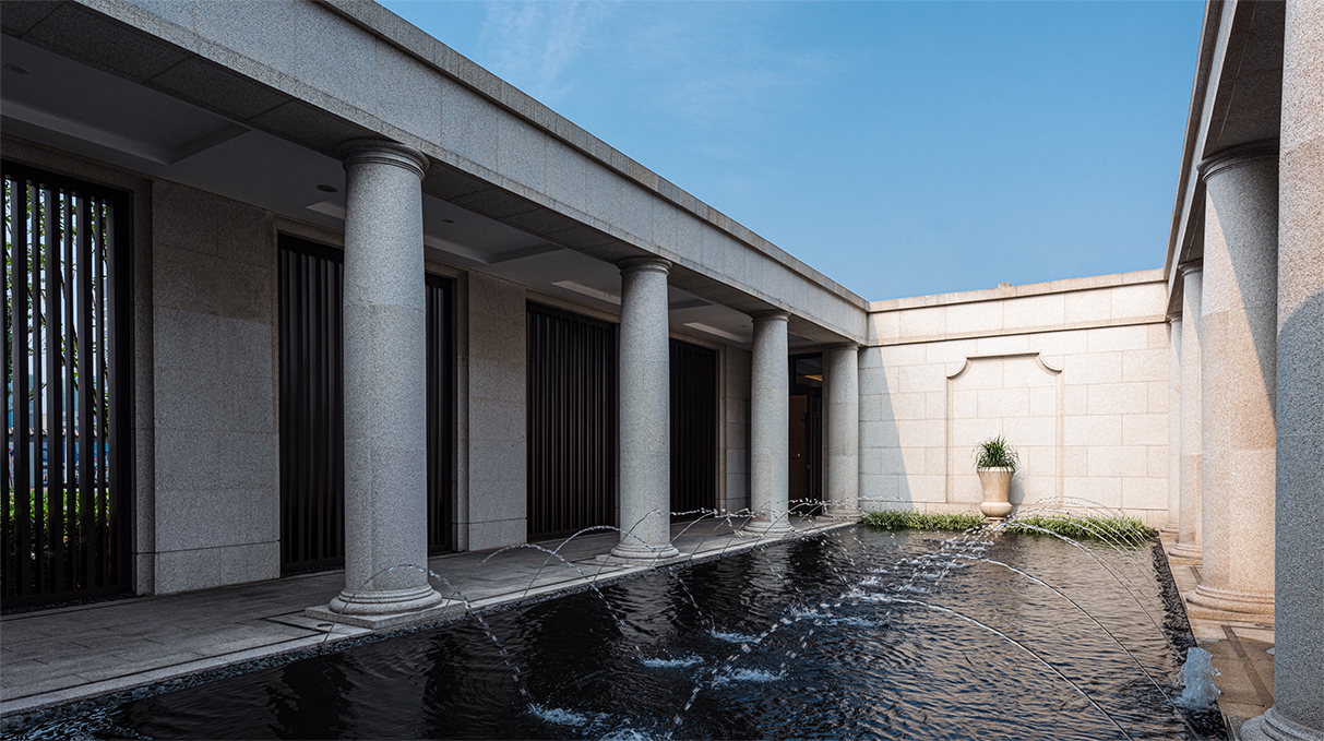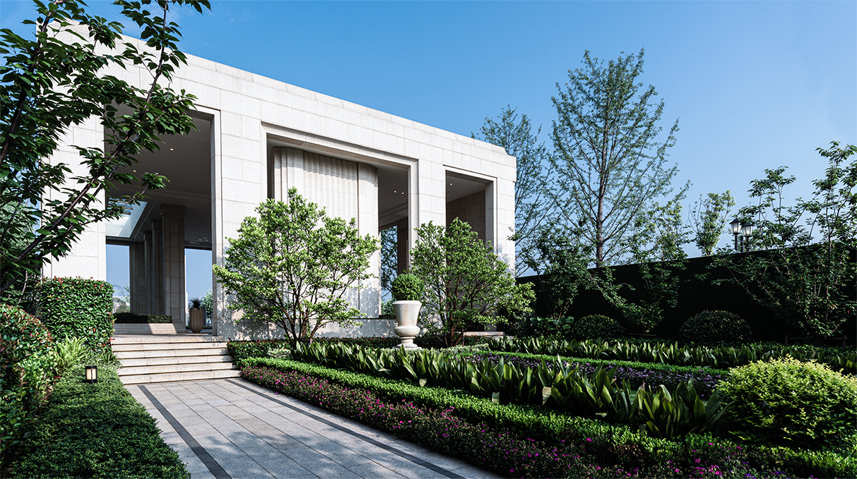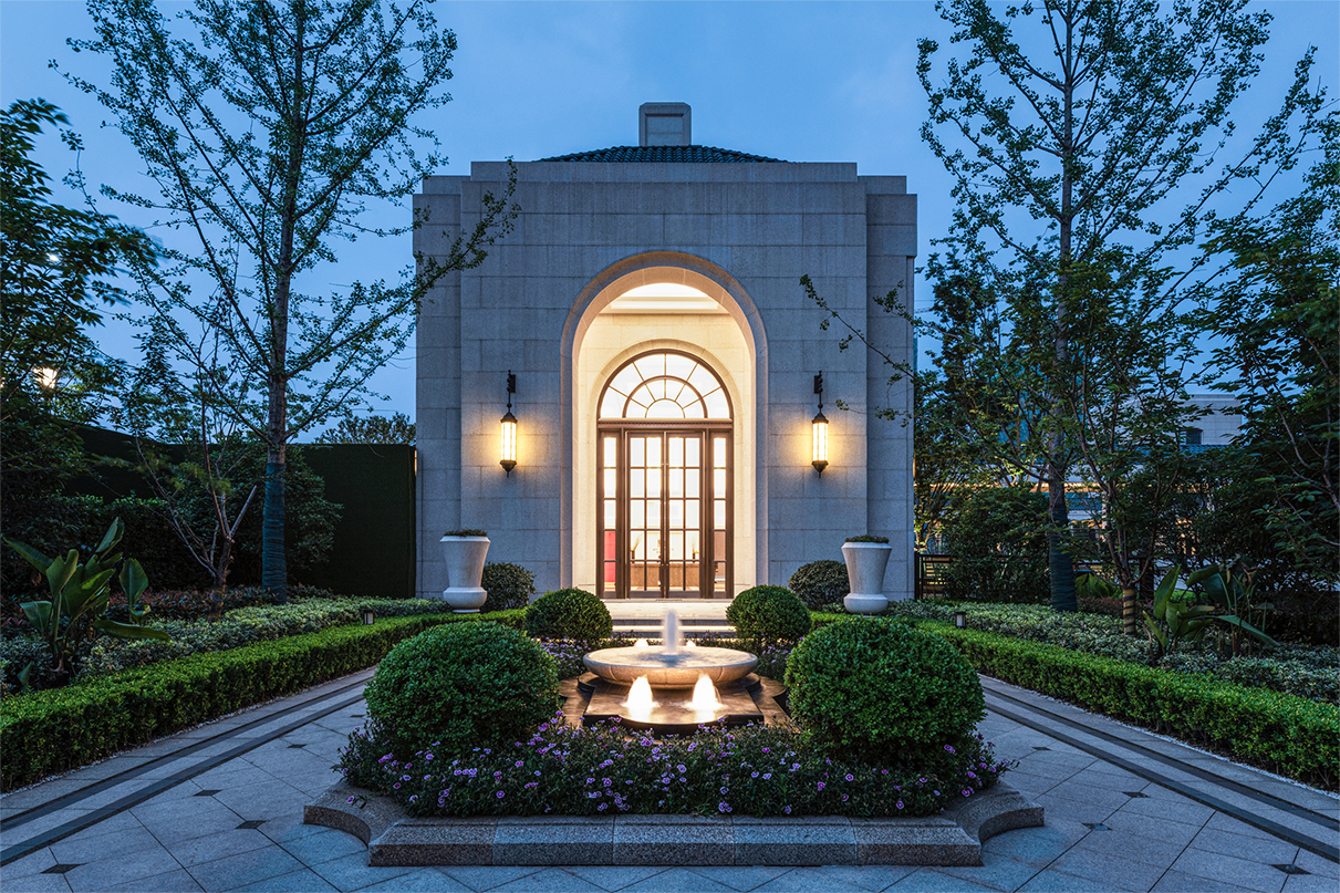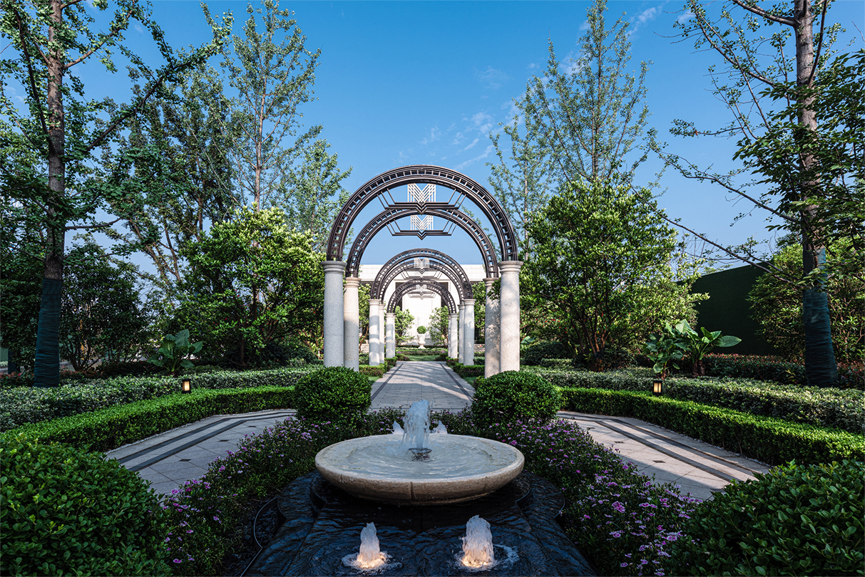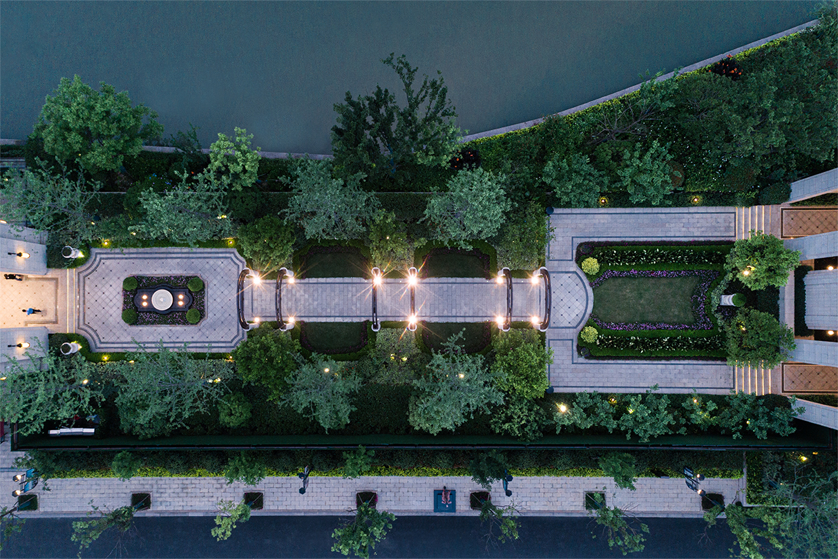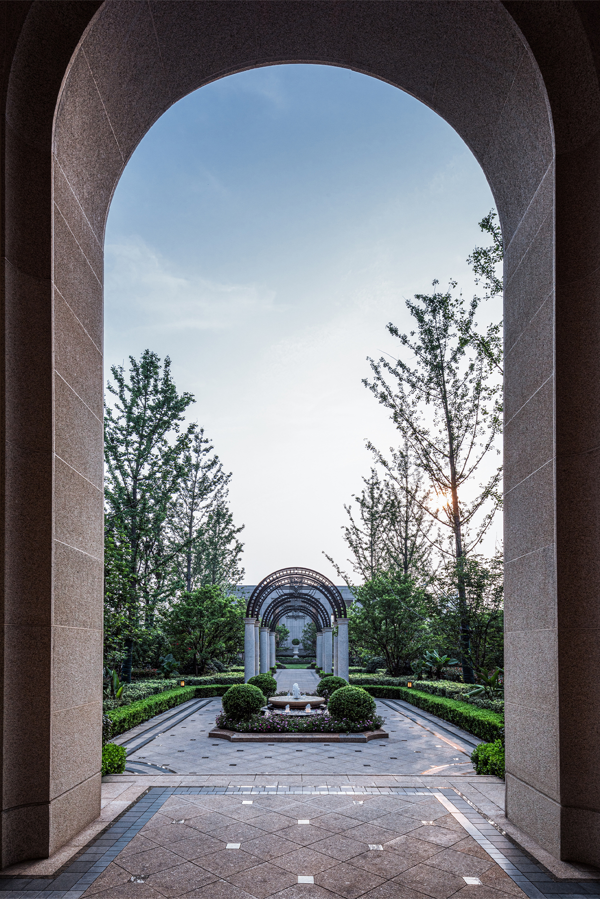 從西側(cè)到達(dá)廣場(chǎng)開(kāi)始,植被陣列清晰界定了廣場(chǎng)的邊界,中心的logo鐘樓昭示了場(chǎng)地精神。整形綠籬、草花和草坪帶來(lái)的柔性松弛感,同迎賓大廳硬朗的儀式感形成有趣的對(duì)比,暗喻從西裝革履的外面的世界回到了自在溫馨的家的心理轉(zhuǎn)換。