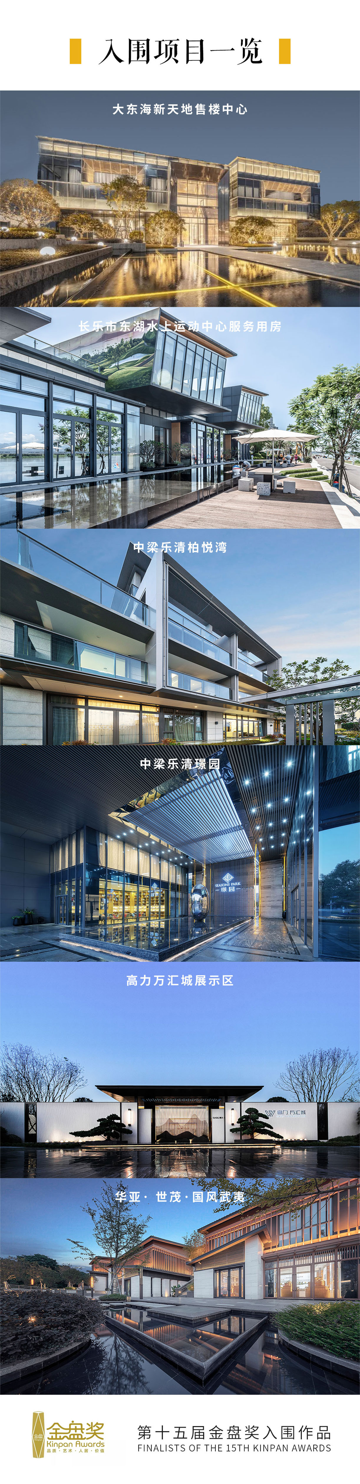 2020年第十五屆金盤獎(jiǎng),本司華亞 · 世茂 · 國(guó)風(fēng)武夷,高力萬(wàn)匯城,中梁樂(lè)清璟園,中梁樂(lè)清柏悅灣,長(zhǎng)樂(lè)東湖水上運(yùn)動(dòng)中心,大東海新天地售樓中心成功入圍。