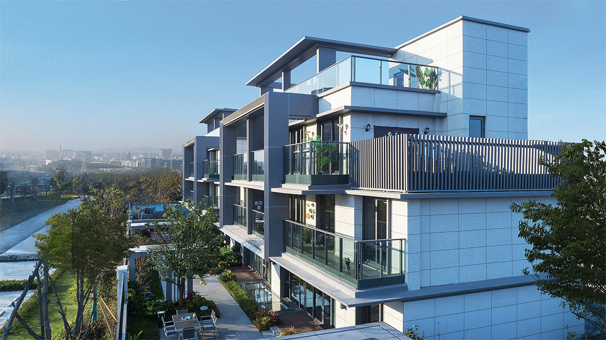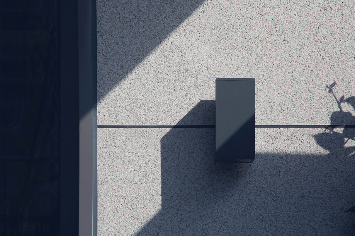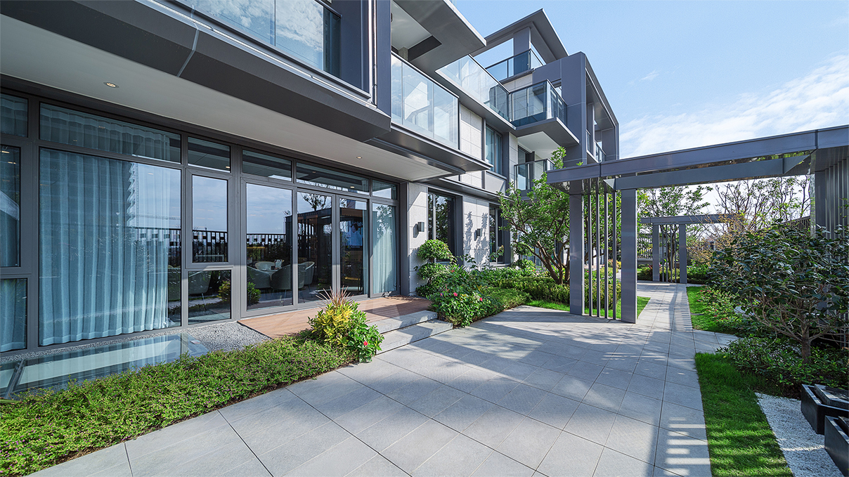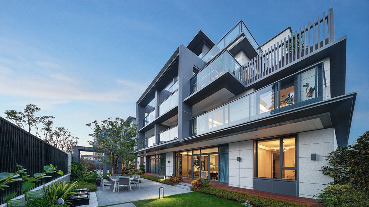 東方禪意與西方現(xiàn)代建筑對(duì)理性簡約美的崇尚,在審美價(jià)值觀層面水乳交融,形成了獨(dú)特的現(xiàn)代典雅建筑風(fēng)格?,F(xiàn)代典雅住宅建筑端莊大氣,設(shè)計(jì)圍繞“純凈簡潔、輕盈飄逸”的理念,減少材料的種類,弱化了構(gòu)件的厚度,突顯形體的輕盈挺拔。每個(gè)形態(tài)單元的構(gòu)圖關(guān)系因此簡化為白色墻面與玻璃之間大實(shí)大虛的鮮明對(duì)比。為塑造形體輪廓的輕盈挺拔,建筑立面主要的豎線條,均做內(nèi)收三角形斜切處理,并以鋁型材收邊。不同材質(zhì)的精美交接,使形體轉(zhuǎn)折更加明確,賦予建筑冷峻的骨感美。