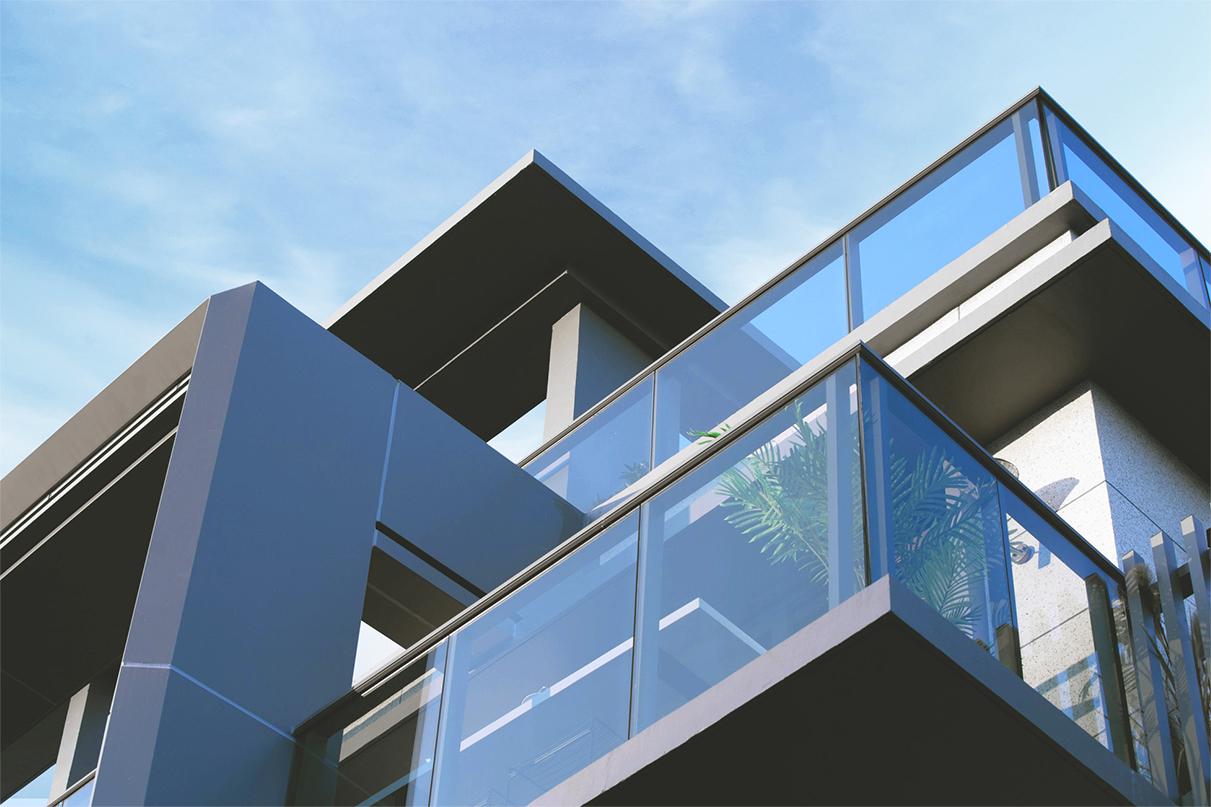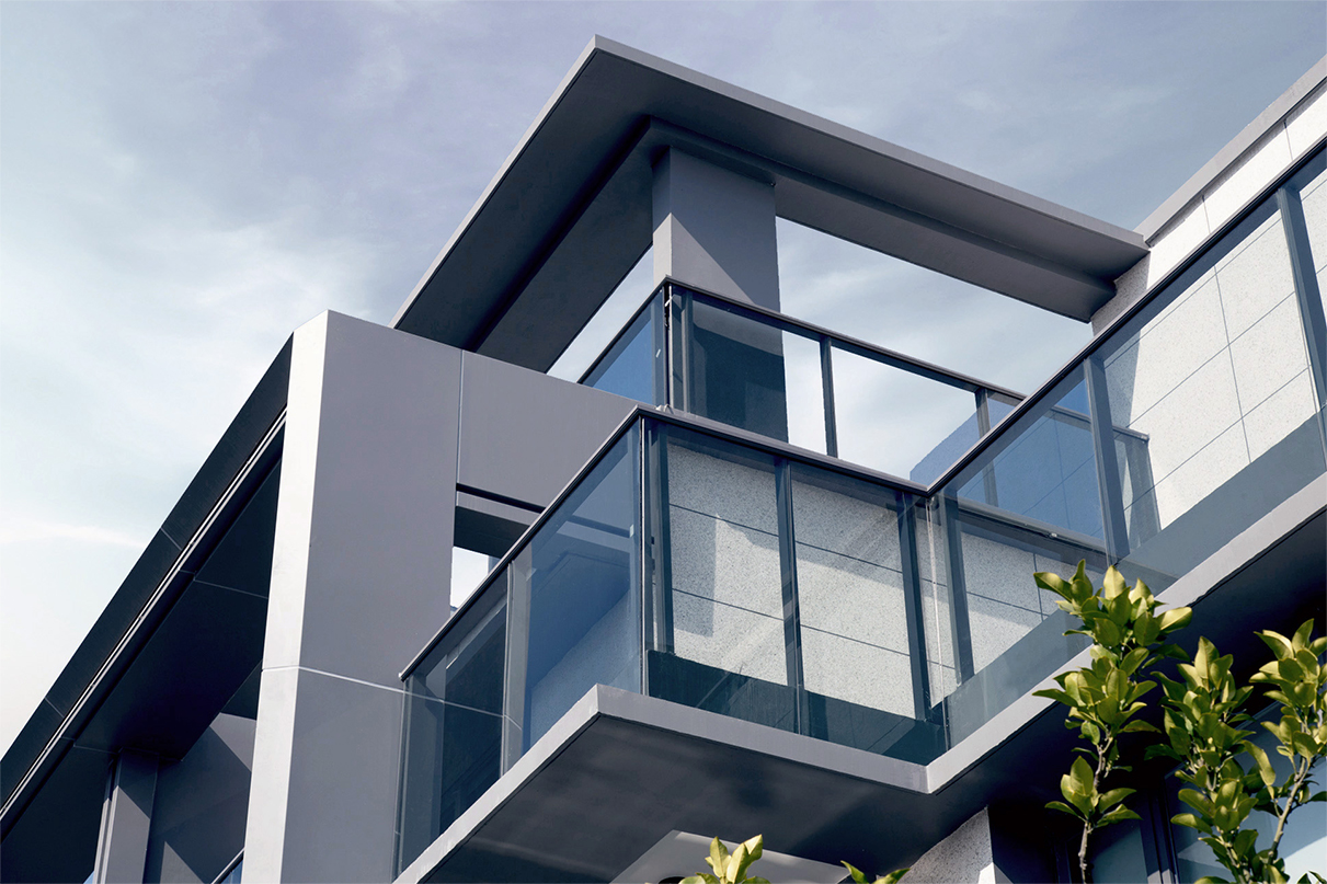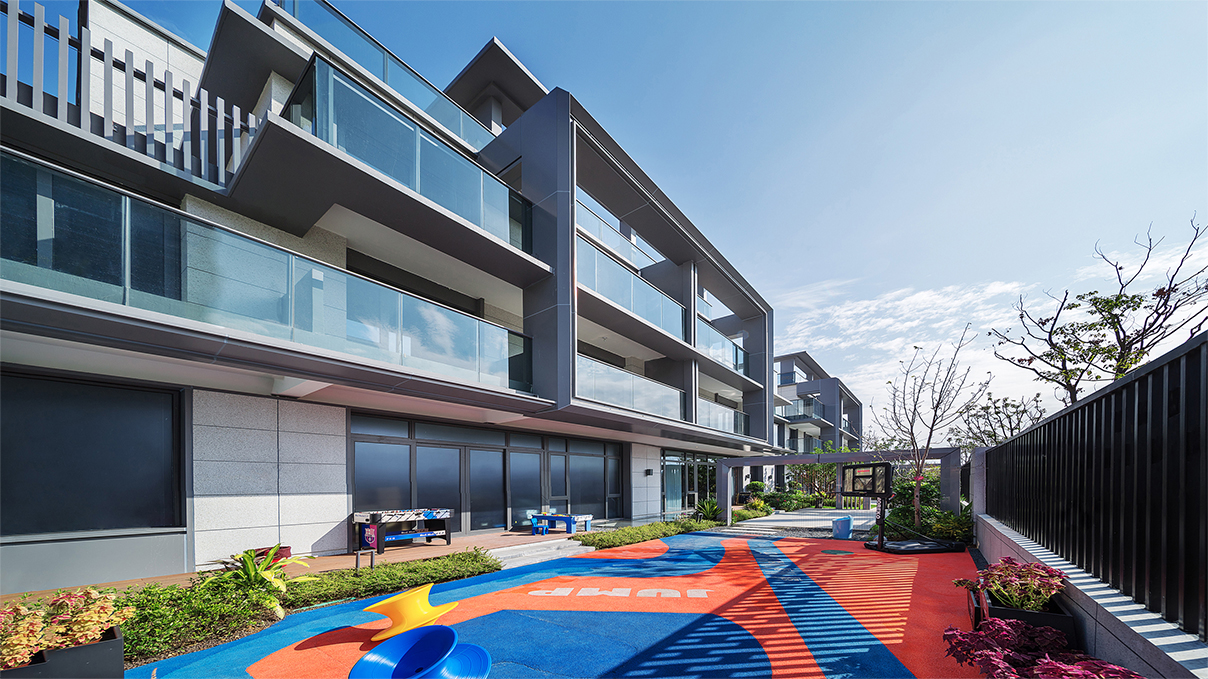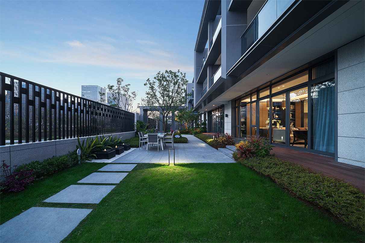 東方禪意與西方現(xiàn)代建筑對(duì)理性簡約美的崇尚,在審美價(jià)值觀層面水乳交融,形成了獨(dú)特的現(xiàn)代典雅建筑風(fēng)格?,F(xiàn)代典雅住宅建筑端莊大氣,設(shè)計(jì)圍繞“純凈簡潔、輕盈飄逸”的理念,減少材料的種類,弱化了構(gòu)件的厚度,突顯形體的輕盈挺拔。每個(gè)形態(tài)單元的構(gòu)圖關(guān)系因此簡化為白色墻面與玻璃之間大實(shí)大虛的鮮明對(duì)比。為塑造形體輪廓的輕盈挺拔,建筑立面主要的豎線條,均做內(nèi)收三角形斜切處理,并以鋁型材收邊。不同材質(zhì)的精美交接,使形體轉(zhuǎn)折更加明確,賦予建筑冷峻的骨感美。