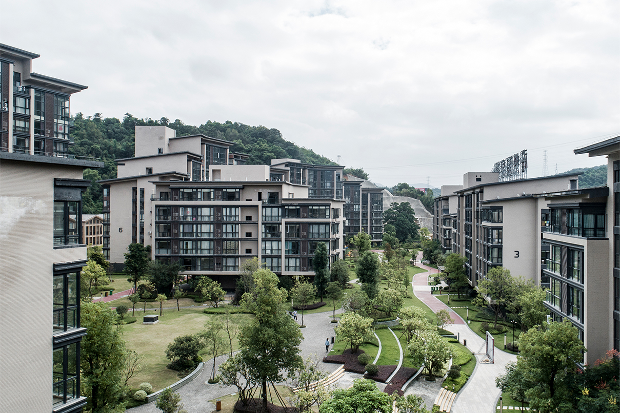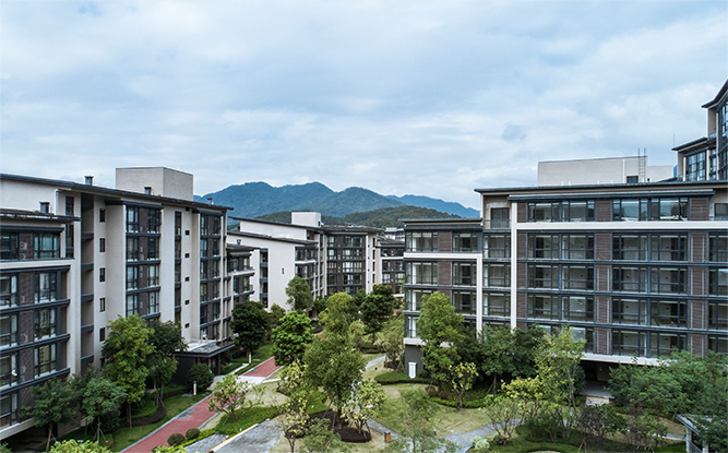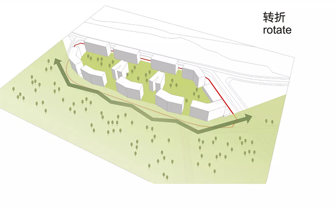 在規(guī)劃設計中,建筑沿基地的周邊布置,對外充分親近南邊景觀與北側(cè)山景,對內(nèi)則圍合成一個超大尺度的內(nèi)向的綠化花園空間。